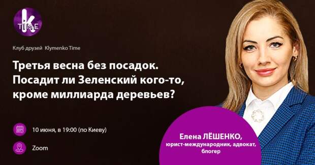 Сегодня, 10 июня, в 19:00 (по Киеву) состоится новая встреча Клуба друзей Klymenko Time! Наша гостья — Елена Лёшенко, юрист-международник, адвокат и блогер. Тема встречи: Третья весна без посадок. Посадит ли Зеленский кого-то, кроме миллиарда деревьев? Когда, где: 10 июня (четверг), 19:00, zoom (зарегистрироваться на встречу) О чем будем говорить: Санкции СНБО заменили суды: можно ли действительно добиться справедливости такими инструментами.