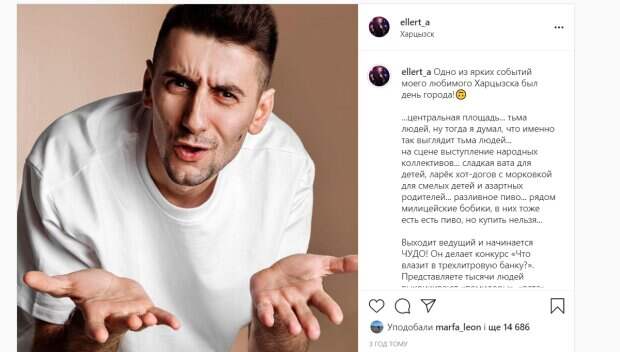 Избранник "Холостячки" Ксении Мишиной Александр Эллерт предложил фанатам забавную игру Как передает Politeka.net, любимый мужчина Ксении Мишиной решил придумать, как развеселить многочисленую армию своиз поклонников в социальной сети Инстаграм. Эллерт вспомнил день города его любимого Харцызска. И как затягивал время в ожидании выступления Ани Лорак, будучи ведущим.