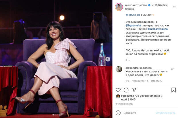 Маша Ефросинина вернулась на "Лигу Смеха" и рассказала о своём лекарстве от всего происходящего Как передает Politeka.net, Маша Ефросинина является известной украинской телеведущей. Она часто появляется в составе жюри в разных шоу, и также поклонники отмечают прекрасное чувство юмора Маши. Сейчас она ведет свою программу на ютуб-канале, где берет интервью у звезд украинского шоу-бизнеса.