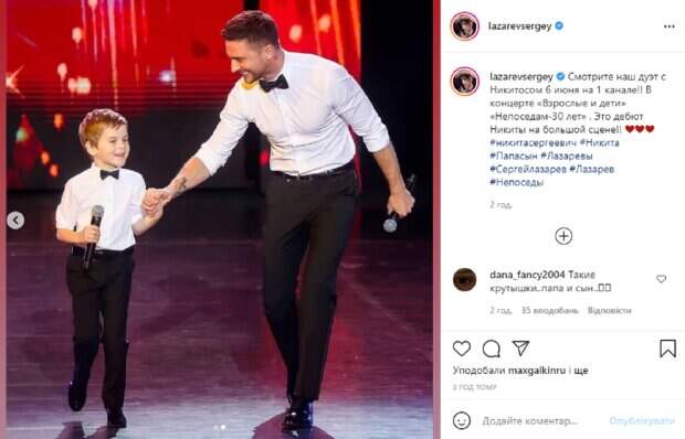 Однако, в этот раз Сергей показал в своем микроблоге в Instagram яркие кадры с сыном на сцене. Оказалось, что артист выступил дуэтом с юным наследником, который был на большой сцене впервые. На новых снимках звездный отец и его маленький сын запечатлены на сцене с микрофонами в руках. Они оба нарядные и в одинаковых образах – темных брюках с белыми рубашками и черными бабочками. В подписи к публикации Лазарев рассказал о дуэте с сыном Никитой: "Смотрите наш дуэт с Никитосом 6 июня на 1 канале! В концерте «Взрослые и дети» «Непоседам-30 лет». Это дебют Никиты на большой сцене!". Поклонники тут же принялись активно обсуждать милые фото нарядного отца с сыном, засыпая их комплиментами в комментариях. "Никитку с дебютом, всех очаровал", "Держись, Евровидение 2030", "Самые лучшие", "Солнышки мои, конечно. Я очень-очень жду и люблю вас", "Такие молодцы! Никита весь в папу, очень круто спели!", "Очаровательные", "Поздравляю Никиту с дебютом. Он большой молодец. Будем ждать с нетерпением", - пишут фанаты в комментариях к фото. Напомним, Страстный "любовник" Ани Лорак засветился с горячей блондинкой в самых смелых позах: "Это потрясающе". Как сообщала Politeka, «Любовник» Ани Лорак променял певицу на знойную блондинку в мини: «С девушкой смотрится как-то…». Также Politeka писала, «Любовник» Лорак Лазарев показал эффектной блондинке, на что способен: с таким хоть на край света.