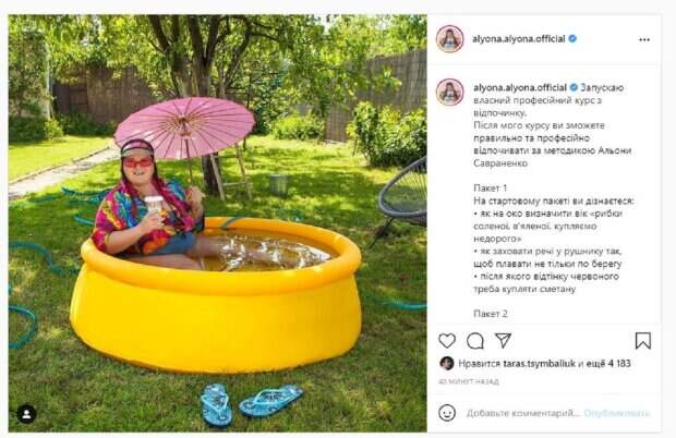На новом фото девушка позировала в купальнике, сидя в детском бассейне. Девушка в руках держала зонтик и стаканчик с напитком. "Запускаю свой профессиональный курс с отдыха. После моего курса вы сможете правильно и профессионально отдыхать по методике Алены Савраненко", - написала Алена. Фанаты, включая Цимбалюка из "Крепостной", поставили тысячи лайков и написали комментарии: "Фото огонь", "Хорошего отдыха", "Девушка из народа. Интересная и умная", "Это самая прикольная реклама, которую я читал за последнее время", "Так не смеялась давно". Напомним, Alyona Alyona в одном купальнике устроила шоу на детской площадке А еще Politeka писала, что Alyona Alyona жестко ответила украинцам из-за скандала с российской группой Также Politeka сообщала, что фигуристая Alyona Alyona, переехав к парню, заговорила о наболевшем