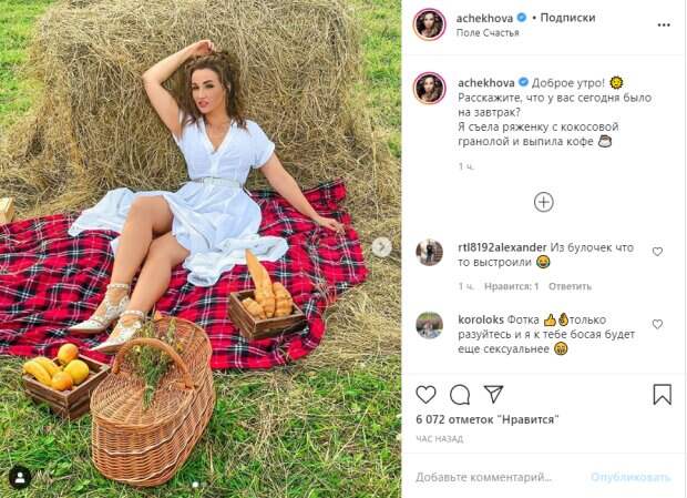 net. В этот раз Чехова решила поделиться с фанатами яркой и красивой деревенской фотосессией, приуроченной, по всей видимости, к уходящему лету. На фото знаменитость кокетливо позирует сидя возле стога сена, выставив напоказ свои стройные ножки. На Анфисе надето легкое белое платье с глубоким вырезом на груди и затянутое поясом на талии. Наряд очень удачно подчеркивает пышную фигуру красотки. Обратим внимание, что телеведущая сидит на подстилке, где также выставлены различные лакомства- булочки, круассаны и фрукты, а также, налит в бокалы алкоголь. «Доброе утро!