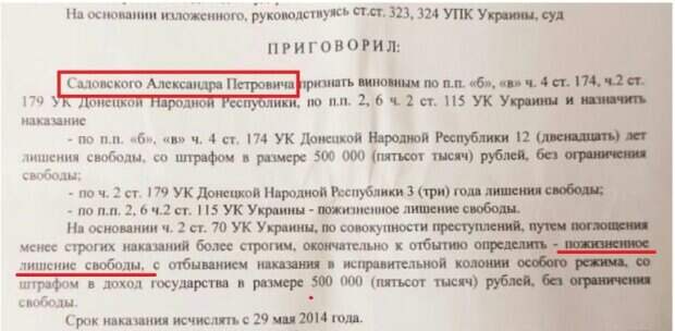 Серед об'єктів, які він охороняв, був пункт обміну валют на вулиці Артема, 131. 21 квітня 2014 року о 8 год. 22 хв. Олександр Садовський у формі охоронника зайшов в кабінку пункту обміну. Нелюд спочатку побив, а потім задушив молоду жінку-касира. Перед тим, як винести здобич, вбивця зробив підпал. Жінку звали Елла Верещак. Вона була на сьомому місяці вагітності. Близько місяця злодій переховувався на Київщині. Купив машину, а частину грошей закопав у родичів. У той час його шукали оперативники СБУ. Не знайшли. Проте донецькі міліціянти були більш удачливими. Садовського затримали у Донецьку і провели досудове слідство (до речі, за нормами українського КПК 2012 року). За три роки Феміда назвала вбивцю “вбивцею”. Докази були “залізобетонні”. Адже кожний крок Садовського на пункті обміну валют фіксувала камера, яка не належала охоронній фірмі, і про яку нелюд не знав. Посилаючись на КПК та КК України, суд невизнаної республіки засудив Садовського до довічного позбавлення волі. Здавалося б, правда перемогла, і справедливість встановлена. Ні! Раптом долею вбивці вагітної жінки переймається команда нового президента України. Садовський невідомим чином потрапляє до списку на обмін полоненими, і у квітні 2020 року повертається на підконтрольну територію.