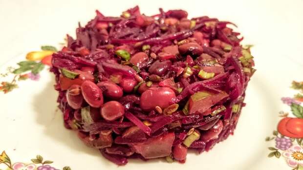 Я не большой любитель фасоли — этот салат мой фаворит. Нет, это не винегрет. Это легкий, аппетитный, вкусный салатик — и очень простой. Без хлопот, из самых обычных и простых продуктов готовится — и со стола исчезает очень быстро: пусть фраза расхожая, зато правильная