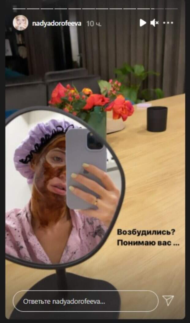 Девушка засняла свое отражение в зеркале, в частности, частично грудь, шею и лицо. На ее плечах была накидка, а на голове специальный чепец. А вот лицо Нади не узнать: звезда нанесла на кожу некую жижу темного цвета. Конечно, можно догадаться, что это косметическая маска, но некоторые, наверно, уже успели испугаться, что, мол, певица с собой сделала. "Возбудились? Понимаю вас...", - с юмором подписала кадр Дорофеева. Видимо, звезда уже готовится к весне и вовсю наводит красоту. До этого Надя порадовала поклонников замечательным настроением во время прогулки, сделав ошеломляющее открытие: "Ребят, вы если в городе, остановитесь, смотрите, вот так... (Надя полной грудью втянула в себя воздух, - ред.) Пахнет весной - отвечаю!" Не отстает от нее по части эпатажа и ее супруг, певец Владимир Дантес. Он тоже любит шокировать публику дерзкими (и, порой, явно странными) выходками. В частности, артист недавно поделился кадрами в "сториз", на которых сидел со спущенными штанами на унитазе. Пока его не окликнули, казалось, что он спит. "Когда что-то вышло из-под контроля (и это не двусмысленная фраза)", - подписал он кадры, добавив пару смайликов. Напомним, что Дорофеева кардинально сменила имидж, покорив чувственным фото: «Совсем на себя не похожа» Как сообщала Politeka, муж Дорофеевой со своим "близнецом" вызвал бурю эмоций у жены Монатика и Козловского: "Надя, ты? " Также Politeka писала, что разгоряченная Дорофеева потрясла "персиками" в полупрозрачном корсете: "Боже, Надюшка..."