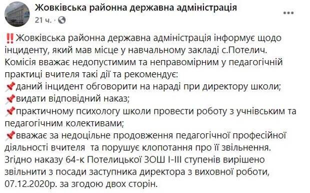 История с учительницей, которая несколько раз ударила по голове шестиклассника в присутствии всего класса, получила продолжнение Так, после того как специальная комиссия рассмотрела инцидент с учителем, было постановлено, что данный факт недопустим и неправомерным в педагогической практике учителя. Поэтому учительницу в селе Потелич на Львовщине уволили и она понесла наказание за этот скандал.