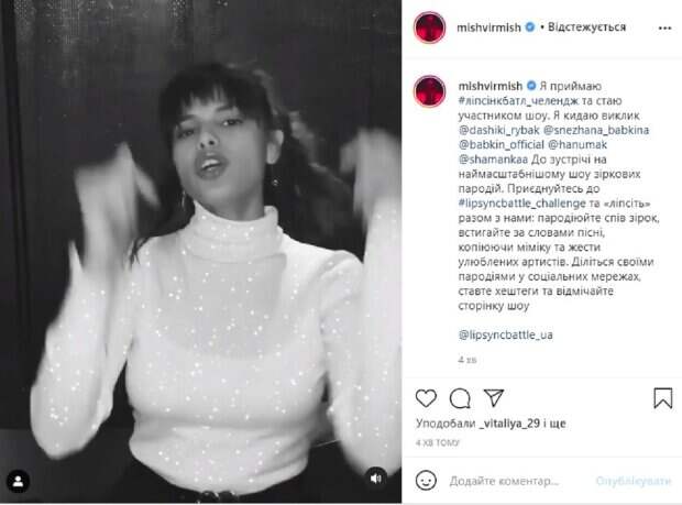 "Я принимаю липсинкбатл_челендж и становлюсь участником шоу", - призналась Мишель. Она бросила вызов Снежане и Сергею Бабкиным, девушке - блогеру Алине, и актрисе Даше Рыбак, а также "кварталовцу" Руслану Ханумаку. В своем видео Мишель чудесно успевала за певицей повторять слова и полностью вошла в образ Jesper. Для видео украинская певица боливийского происхождения надела белую кофточку под горло, и использовала фильтр, чтоб украсить свое выступление и сделать его более красочным. Также Мишель обратилась к украинцам, чтобы они присоединялись к челенджу: "пародируйте пение звезд, успевайте по словам песни, копируя мимику и жесты любимых артистов. Делитесь своими пародиями в социальных сетях, ставьте хэштеги и отмечайте страницу шоу", - подытожила знаменитость. Поклонники Мишель и коллеги, с удовольствием посмотрели, как Мишель "липсит" и оставили за несколько минут множество комментариев, смайликов и восторженных отзывов. "Прекраснаяяяя❤️❤️", " Ох ты блин