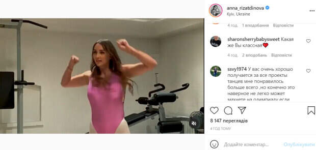 Даже в гимнастику я пошла из-за своей тяги к танцам, а после проекта «Танцы со звездами» вообще окончательно и бесповоротно влюбилась! Танцы ощущаются по-другому. Выходя на паркет, у тебя нет предметов в руках, ты не волнуешься о булавах или ленте. Да, ты сосредоточен на шагах, но успеваешь получать удовольствие и кайфовать», - призналась Ризатдинова. В комментариях молодой красотке оставили массу восторженных слов. «Какая же Вы классная», «У вас очень хорошо получается. За все проекты танцев мне понравилось больше всего», «Прикольно», «Этот купальник просто бомба», - пишут пользователи сети. Напомним, что Анна Ризатдинова похвасталась гибкостью в одном купальнике: "Новые виды активности". А еще Politeka писала, что Анна Ризатдинова высказалась о результатах Украины на Олимпиаде: "Несмотря на...". Также Politeka сообщала, что Анна Ризатдинова впечатлила внешностью в юности: «Тонкая, звонкая и прозрачная».