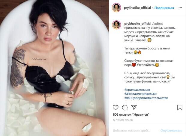 «Люблю принимать ванну в холод, слякоть, мороз и представлять как сейчас мерзко и неприятно людям на улице. Занавес. Теперь можете бросать в меня тапки. Скоро будет именно та холодная пора. Утепляйтесь», - написала певица. Впрочем, ради фото она все же решила оставить на себе белье. Так, на снимке Приходько лежит в ванне с лепестками белых роз. На ней черный боди, одну бретельку которого певица кокетливо приспустила с плеча. Звезда собрала волосы вверх и дополнила свой образ легким естественным макияжем. Ее поклонники бурно отреагировали на чувственный снимок. «Я тоже так люблю делать ты красавица», «Ну такой фотки мы точно не ожидали) Какая же Вы красивая», «Красавица», «Что за грязь на руках?», «Очень красивая», «Спасибо, что не голая. Норм», «Два в одном: Супер революционерка и полный гламур! Пора уже определиться в этой жизни», «Повышаем градус выше», - пишут люди в комментариях. Напомним, Приходько разоткровенничалась о жизни с мужем-тираном, доставалось даже маленькой дочери: «Он так сильно…». Как сообщала Politeka, Приходько объяснила, куда нужно сходить не уважающим Украину россиянам. Также Politeka писала, что Приходько оголилась ради пикантного фото, переплюнув даже Астафьеву с Никитюк: «Огонь-пожар».