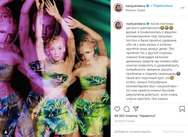 "После глоточка детского шампанского😂😂😂 друзья, я ознакомилась с вашими комментариями под прошлым постом и была приятно удивлена, ибо не у всех жизнь и хотелки крутятся лишь вокруг денег. Это приятно!", - подписала Ивлеева фото. К слову, в предыдущем посте блогерша спросила у пользователей, что им не хватает, чтобы 100% почувствовать себя уверенными. "С другой стороны, именно благодаря наличию денежных средств мы можем себе многое позволить и удовлетворить потребности, желания, решить проблемы и поднять самооценку🤷🏼♀️ такой вот порочный круг...хм🤔 кстати, самым популярным комментарием был «лишний вес»", - добавила Настя. Люди с жаром кинулись комментировать, расхваливая Ивлееву за внешний вид: "Икона стиля 👑❤" "Лишний вес хуже бедности👍" "Ух🔥" "Бомба❤️" "кайф😻🤤" "Огонь пожар пушка🔥🔥🔥🔥" "вот тебя плющит" "Что за мужик на заднем плане??" "Это Джей Ло?" Ранее мы сообщали, Ивлеева жестко поиздевалась над певцом Николаем Басковым, ставшим первым гостем в ее новом шоу. Так, Настя, прицепила артисту на язык прищепки, а также связывала его. "Ты просто бомба и колян тоже смотрим ! Бомбим"; "Я смотрю и ору, НАСТЬ! Это не слёзы, а дождь!"; "Начал смотреть шоу и первое задание, просто вынос мозга😱"; "А Колян то тоже смотрю любит поржать, а то все аристократ аристократ 😂👍", - отреагировала публика. Напомним, что мать Ивлеевой из "Орла и решки" не устояла перед Басковым, видео поцелуя: "Мама красивее Насти" Как сообщала Politeka, Ивлеева из "Орла и решки" эффектно присела в майке-алкоголичке: "народ хочет Элджея, а не..." Также Politeka писала, что Ивлеева из "Орла и Решки" поменяла стиль и ошеломила новым образом: "Дуа Липа, ты ли это?"