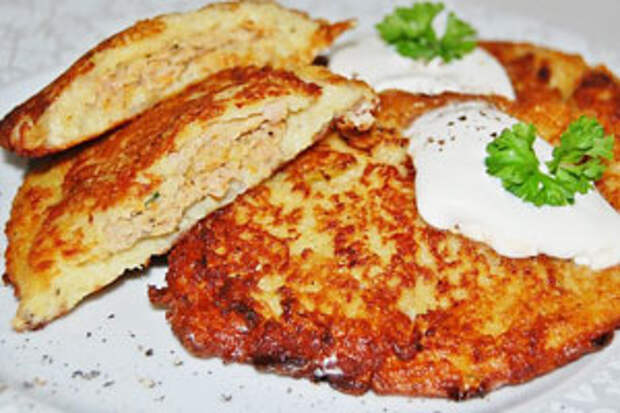 У этого блюда несколько названий, например, драники, деруны, оладьи либо колдуны. Такая еда широко распространена в белорусской, чешской, русской, украинской, еврейской и восточноевропейской кухне. Есть множество рецептов приготовления данной вкуснятины, ну а мы предлагаем вам довольно интересный вариант из двух видов овощей и с мясной начинкой, называется это чудо картофельно-кабачковые колдуны!