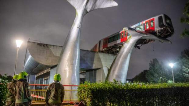В нидерландском городе Спейкениссе недалеко от Роттердама поезд метро врезался в барьер и упал на хвост скульптуры кита, сообщает издание Dutch News. Авария произошла на конечной станции метро De Akkers. Часть поезда повисла на хвосте на высоте десять метров. Это удерживает конструкцию, и она не падает в воду.