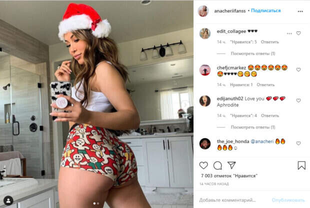 Одно из таких порадовало фанатов – Чери блеснула достоинствами в необычной пижаме – коротеньких красных шортиках с рисунками человечков в костюмах, белой майке без рукавов и красной шапке Санта-Клауса. Как известно, на днях Ана отправилась на бурную вечеринку с подругами, где они вместе украшали елки, веселились и танцевали с игрушками в руках. Похоже, звезда во всю готовится к празднованию Нового года. «Красивая девушка ❤️❤️; все мое и роскошное