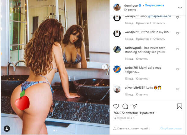 Позируя спиной к объективу, девушке удалось показать и ягодицы, и бюст сразу. Так как модель рекламирует белье, она совсем не боится демонстрировать свое тело в смелых образах и экспериментировать. Поэтому на странице Роуз можно увидеть множество подобных жарких кадров. В синем бикини с трендовым принтом Деми выглядела очень соблазнительно. «Зеркало, зеркало на стене ... кто полюбит меня больше всего?,» - загадочно написала Роуз под постом. Вот как реагируют поклонники: «Нет мне покоя после таких фото», «Просто идеальная», «Роскошь, ух», «черт возьми, просто идеальная», «Обе стороны классные, детка», «Беллиссима! Нельзя не влюбиться» «Ни один. Никто», «Блин, как я заставлю тебя чувствовать», «Que hermosa», «Мой канал на YouTube полюбит тебя, Деми