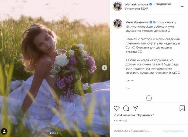 При этом красотка находилась на белоснежной постели среди зеленой травы. Так, на другом фото Краснова улеглась на свою импровизированную кровать, прикрыв тело простыней. Модель закинула волосы набок и смотрела в камеру своим глубоким взглядом. На последнем кадре Алена легла на живот, засветив обнаженную спину и трусики-бикини. Фото получились очень яркими и жаркими. В посте невестка Пугачевой призналась, что снимки были сделаны в июне. "Решили с сестрой и моим сладкими племянником слетать на недельку в Сочи)) Считаем дни до нашего отъезда🤞🏼 в Сочи никогда не отдыхала, но друзья все очень хвалят! Буду рада, если поделитесь интересными местами, лучшими пляжами и тд🙏🏼", - обратилась Алена к подписчикам. За час пост собрал более 2000 лайков и много комментариев. "На последнем фото, бикини помешали. Лучше бы чуток попки было видно без них. Фотки классные", "Красотка! 👍❤️💋", "Мы тоже собираемся в Сочииии, хороший выбор! Фотки прям классные, как и Алена!!!💜👍💜", "Девушка неземной красоты!", "👍красавица", - написали пользователи сети. Напомним, Алена Краснова позировала прямо на траве посреди огромного ромашкового поля. Модель одета в короткое розовое платье на тонких бретельках и с глубоким декольте. Напомним, юная невестка Пугачевой с младенцем на руках ошарашила известием: "Сегодня я стала...". Как сообщала Politeka, внук Пугачевой слетел с катушек и набросился на фанатов из-за критики нового видео. Также Politeka писала, что юная невестка Пугачевой задрала платье на пикнике, Орбакайте не удержалась.