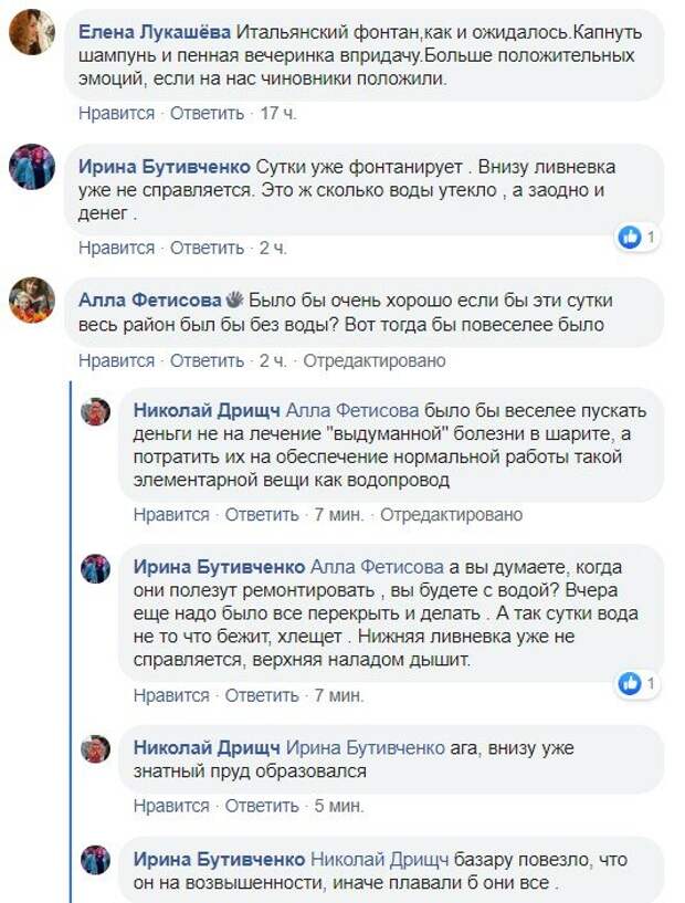 «Какое-то водное шоу от водоканала под самим водоканалом. Маселя», – подписали видео последствий поломки в группе «Типичное ХТЗ». А «ВЕХА Харьков» опубликовала видео, сделанные вчера вечером и сегодня утром. Как видно на кадрах, вода на сотни метров залила прилегающие улицы, вплотную подобралась к рынку. «Сутки уже фонтанирует. Внизу ливневка уже не справляется. Это ж сколько воды утекло, а заодно и денег», «базару повезло, что он на возвышенности, иначе плавали б они все», «Вчера еще надо было все перекрыть и делать. А так сутки вода не то, что бежит, хлещет. Нижняя ливневка уже не справляется, верхняя на ладан дышит», «внизу уже знатный пруд образовался», «было бы веселее пускать деньги не на лечение "выдуманной" болезни в шарите, а потратить их на обеспечение нормальной работы такой элементарной вещи как водопровод», – пишут харьковчане под публикацией. Ранее мы рассказывали о том, что к началу отопительного сезона часть Харькова может остаться без тепла. Причина – задолженность перед «Нафтогазом». Среди должников – теплосети Роганского поселкового совета, областной информационно-технический центр КП, ОСББ «Азалия 2013», «Квітень-2011», «Наш дом 20-А», Харьковское УВП №1 УТОС. Напомним, состояние дороги возле метро в Харькове показали во всей красе. Как сообщала Politeka, харьковчане попали в ловушку коммунальщиков. Также Politeka писала, что в Харькове десятки миллионов гривен закатают в асфальт.