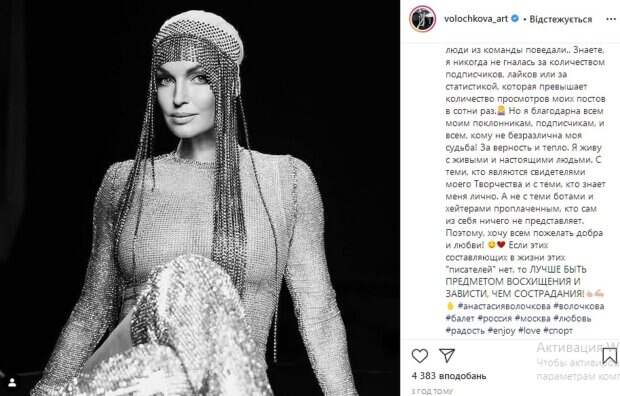 Мои добрые люди из команды поведали.. Знаете, я никогда не гналась за количеством подписчиков, лайков или за статистикой, которая превышает количество просмотров моих постов в сотни раз», - говорится в сообщении. Уточним, что Волочкова поблагодарила своих поклонников за слова тепла и поддержки, а также резко обратилась к хейтерам. «Я живу с живыми и настоящими людьми. С теми, кто являются свидетелями моего Творчества и с теми, кто знает меня лично. А не с теми ботами и хейтерами проплаченным, кто сам из себя ничего не представляет. Поэтому, хочу всем пожелать добра и любви», - говорится в тексте сообщения. Примечательно, что на опубликованном снимке Волочкова позирует в облегающем наряде, который подчеркивает ее «выпяченную» фигуру. При этом уже традиционно комментарии знаменитость решила закрыть из-за чрезмерного количества критики. Люди обвиняют звезду в двуличии. Напомним, скандальная Волочкова после Мальдив замоталась в целлофан, поразив новой внешностью А еще Politeka писала, что "обуглившаяся" Волочкова взбудоражила видом в бикини с блестящим бюстом Также Politeka сообщала, что бесстыжая Волочкова устроила шалости в океане, провокационные кадры