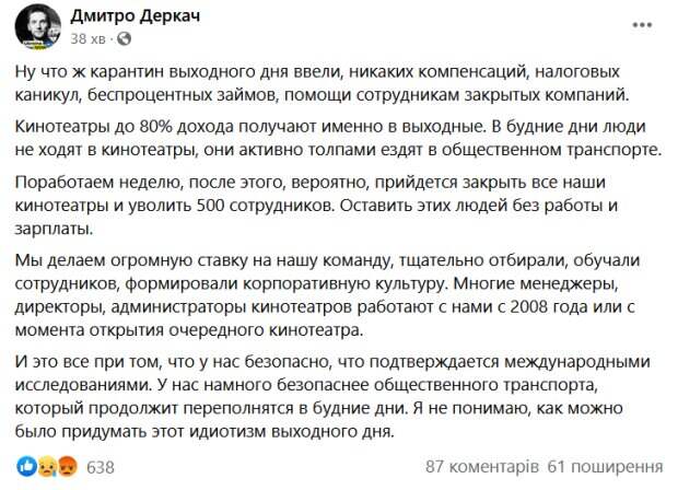 В Украине ввели карантин выходного дня, однако не предусмотрели никаких компенсаций для бизнеса Об этом в своем Фейсбук пишет совладелец сети «Планета Кино» Дмитрий Деркач. Далее приводим слова автора без изменений. Ну что ж карантин выходного дня ввели, никаких компенсаций, налоговых каникул, беспроцентных займов, помощи сотрудникам закрытых компаний.