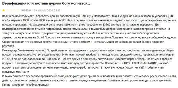 На последнем платеже мне начали задавать вопросы с целью верификации, но все прошло нормально. На следующий день через терминал я внес на свой счет 13500 и снова попытался их перевести. Для подтверждения платежа от меня потребовали позвонить на 3700, а там начали допрос», - пожаловался мужчина. По его словам, он ответил на все вопросы, однако назвал не тот адрес электронной почты, так как у него их два. После этого его счет заблокировали. Для верификации своей личности клиент предоставил банку селфи с паспортом и указал верные данные. Однако уже после прохождения верификации при входа в приложение Приват24 у него начали требовать пин-код карты, срок действия которой закончился еще в 2016г. Украинец рассказал, что пользуется интернет-картой, однако теперь от него требуют получить пластиковую карту и только после этого обещают, что он сможет пользоваться Приват24. «Повторяю — я прошел верификацию, но чтоб получить доступ к своим деньгам меня вынуждают вместо работы постоять часок в очереди (карантин, не?) чтобы получит ненужную мне карту», - возмутился украинец. В свою очередь, представители ПриватБанка пояснили, что такие меры нужны для защиты клиентов банка от мошенников. «В банке работает комплекс технических и программных средств, которые позволяют выявить и предотвратить мошеннические операции на разных уровнях. Прежде всего, мы стараемся не допустить проведения таких операций и надеемся на Ваше понимание в необходимости таких механизмов, которые позволяют нашим клиентам каждый день не переживать о безопасности своих средств. Для решения вопроса с разблокировкой карты, вы можете обратиться в онлайн помощь на нашем сайте», - заявили в банке. Напомним, ПриватБанк блокирует счета, украинцы остались без отпускных. Как сообщала Politeka, счета блокируются после перевода денег, в ПриватБанке ошарашили решением. Также Politeka писала, что ПриватБанк оставил украинцев без денег, в работе терминалов сбой.