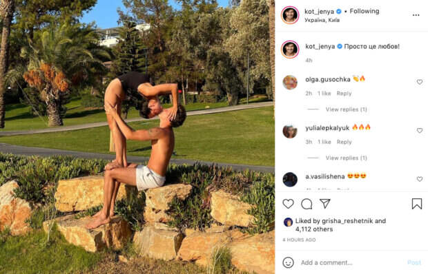 Через несколько месяцев они смогли одержать победу, а сейчас они стали новыми судьями шоу "Україна має талант. Так, на этот раз Евгений Кот поделился новой публикацией на своей странице в Инстаграм. На кадре он вместе со своей женой Наталией Татаринцевой необычно позирует. Он сидит, а его жена в сложной гимнастической позе наклоняется к нему и целует его.  "Просто это любовь", - описал чувства Евгений Кот. Поклонники танцора оставили множество приятных слов в комментариях: "Поломаешь жену", "Любовь как произведение искусства! Вау!", "Какие же вы красивые", "Хочется увидеть нормальные фото вашей пары без выкрутасов", "Очень красиво", "Вы шикардосные", "Та, ну, да. Украина мае талант на выезде.", "И, как всегда, трудности достались женщине. А мы...просто сидим", "Это невероятно!". Ранее сообщалось, судья "Україна має талант" Женя Кот померился умениями с молодой красоткой: "На Джонни Деппа похож" Также, судья "Україна має талант" Женя Кот с женой на руках показал, на что способен: "Уметь любить..." Politeka рассказывала, судей "Україна має талант" Кота и Мишину довели до слез: "Никогда бы не подумал..."