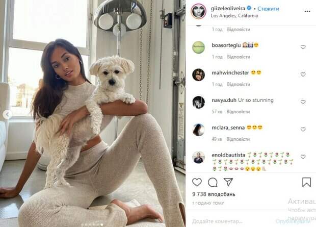 Бразильская супермодель Жизель Оливейра, звезда Victoria’s Secret, впечатлила красотой в одном топе Как рассказывает Politeka, снимки были опубликованы в Instagram знаменитости. «Бибер», - коротко подписаны кадры. Уточним, что на опубликованных кадрах Оливейра позирует сперва с собачкой, а потом сама.