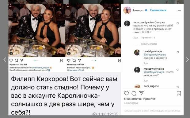 Так, на фото, выложенном у себя в аккаунте, артистка заметно стройнее, чем на снимке у Филиппа Киркорова. Такое несовпадение кадров заметила популярная блогерша Лена Миро, выложив соответствующий пост у себя в Инстаграм. "Очень нехорошо", - написала она и добавила: "Филипп Киркоров! Вот сейчас вам должно стать стыдно! Почему у вас в аккаунте Каролиночка - солнышко в два раза шире, чем у себя?!", - написала блогерша. Запись собрала более 6000 лайков и много комментариев. Некоторые пользователи сети написали, что фото якобы удалили, однако на самом деле снимок остался в карусели. Так, у Киркорова снимок размещен в посте от 23 августа, также и у Ани Лорак только 31 августа. "Они уже удалили что ли эту фотку у себя? Я зашел к ним в профили и нет такого