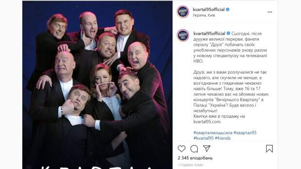 Снимок комиков подписан характерным шрифтом из фильма "Друзья". Так, в подписи к снимку "Квартал 95" идется, что украинцев приглашают на съемки концерта. "Сегодня, после ооочень большого перерыва, фанаты сериала "Друзья" увидят своих любимых персонажей снова вместе в новом спецвыпуске на телеканале HBO. Друзья, мы с вами расставались не так надолго, но соскучились не меньше, а воссоединения со зрителями ждем даже больше! Поэтому, уже 16 и 17 июля ждем вас на съемках новых концертов "Вечернего Квартала" в Дворце "Украина"! Будет весело и незабываемо!", - написано под фото. Фанаты тут же принялись комментировать концерт любимых "кварталовцев", не обошлось и без критики: "Когда Володьку назад заберёте???? Ато там,не все его юмор понимают