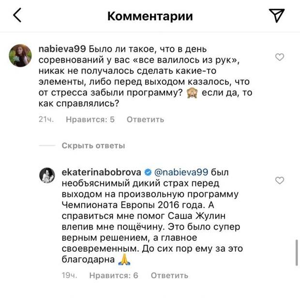 Александр Жулин ударил девушку на чемпионате Европы. Бывшая русская фигуристка Екатерина Боброва устроила вечер Q&A в инстаграме. Олимпийская чемпионка-2014 в командном турнире попросила, чтобы подписчики придумали интересные вопросы, которые ей еще не задавали в интервью. Одна из пользовательниц спросила Боброву, как спортсменка справлялась с сильным волнением перед выступлением.