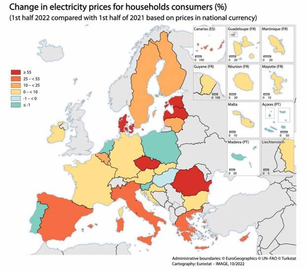 Евростат опубликовал данные о росте цен на газ и электричество в европейских странах с начала украинской спецоперации. Так, по данным статистического ведомства, больше всего от подорожания электроэнергии страдают жители Чехии, где электричество стало дороже на 62 процента.