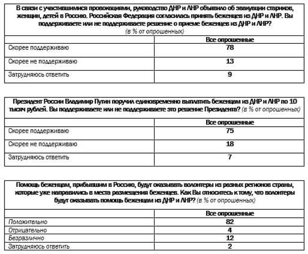 Большинство россиян поддерживают решение о приеме беженцев из ДНР и ЛНР в связи с участившимися провокациями на территории республик (78%). Не поддерживают решение 13% опрошенных. Такие данные опубликовал ВЦИОМ, передает корреспондент «ПолитНавигатора».