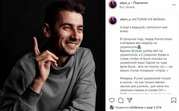 net. В прошлом году, еще до "Холостячки", он впервые вел свадьбу на украинском языке со своим будущим соперником на шоу Андреем Рыбаком. У Рыбака проблем не возникло, а вот после того как Эллерт в очередной раз оконфузился, сказав «...на ваших столах помідори і огірЦІ...», жених не выдержал и позволил ведущему разговаривать на русском, лишь бы тот не позорился. Теперь же впервые со времен школы Эллерт решил заняться украинским языком и предложил поклонникам игру: они пишут ему слово на русском - он переводит на украинский. Подписчики в комментариях предложили десятки интересных вариантов, некоторые рассказали курьезные истории из собственного опыта. "Помню твои «огірці» как будто это было вчера", — пошутил над коллегой Андрей Рыбак. Напомним, избранник Мишиной Александр Эллерт рассказал, что было фикцией в "Холостячке": "Видно было сразу..." Как сообщала Politeka, Эллерт раскрыл, почему до сих пор не показывает Мишину родителям: "Мама сразу сказала..." Также Politeka писала, что Эллерт довел Мишину до истерики, что не показали зрителям «Холостячки»: «Всю группу на уши подняла».