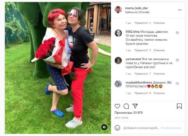 На новых кадрах в Инстаграм можно увидеть, как Наташа и Людмила обнимаются. Мама была в шортах и короткой футболке, задрав одну ножку, одной рукой обнимала дочь, а во второй руке держала букет шикарных цветов. "Мама. Дочь", - написала Людмила под кадрами. Фанаты посмотрели видео более 23 тысяч лайков и написали комментарии: "Что может быть лучше - дочь и мама рядом", "Я вас люблю, позитивные", "Восхищаюсь жизнелюбием", "Как хорошо, когда мама приехала", "Всё так наиграно,а глаза то у Натальи грустные и не горят!Зачем всё это?", "Возможно красотки, мне они неприятны". Напомним, муж Наташи Королевой Тарзан запутался в своих волосах, насмешив сеть А еще Politeka писала, что сын Наташи Королевой и Тарзана опозорился с хитом Макса Барских Также Politeka сообщала, что Королева разозлила сеть неприличным поведением рядом с Тарзаном
