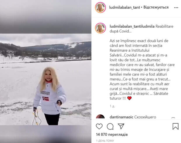 «Сегодня ровно два месяца с тех пор, как я была госпитализирована в реанимационное отделение... Ковид напал на меня и сильно ударил... Я благодарю врачей, которые спасли меня, фанатов, которые присылали мне сообщения поддержки, и мою семью за то, что всегда были со мной... Сейчас я нахожусь на реабилитации, много свежего воздуха и много движений... Будьте очень осторожны», - отметила артистка. Женщина записывала видео на свежем воздухе, показывая, как прыгает на скакалке. В комментариях поклонники оставили женщине массу приятных слов и пожеланий. «Скорейшего восстановления и здоровья вам!», «Мама Люда. Слава богу с вами все хорошо. Мы так скучали, берегите себя», «Мы скучали по вам. Скорейшего восстановления! Счастья и добра», «Мы за вас переживали, но Слава Богу все позади. Мы вас очень сильно Любим!», - пишут пользователи сети. Напомним, что довольный Дан Балан с "распахнутым" пиджаком заговорил загадками, неожиданное фото: "В сердце Тины...". Ранее на Politeka мы писали, что редкие кадры с отцом Дана Балана попали в сеть: на кого похож "молдавский сердцеед". На сайте Politeka мы рассказывали, что счастливый Дан Балан прислонился к жгучей блондинке - копии Тины Кароль: "Нереальное сходство. ..".