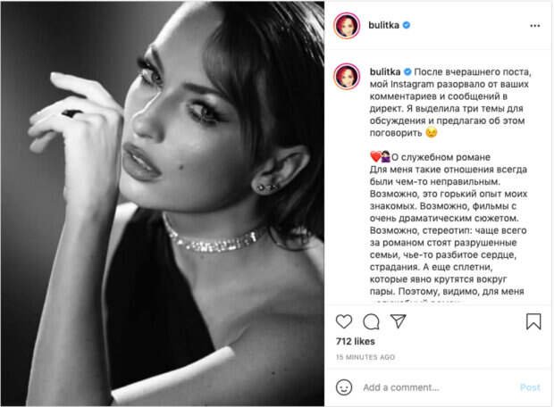 На черно-белой портретной фотографии девушка в образе вамп. Такой снимок отлично дополняет откровенный пост девушки о служебном романе. "После вчерашнего поста, мой Instagram разорвало от ваших комментариев и сообщений в директ. Я выделила три темы для обсуждения и предлагаю об этом поговорить. О служебном романе Для меня такие отношения всегда были чем-то неправильным. Возможно, это горький опыт моих знакомых. Возможно, фильмы с очень драматическим сюжетом. Возможно, стереотип: чаще всего за романом стоят разрушенные семьи, чье-то разбитое сердце, страдания. А еще сплетни, которые явно крутятся вокруг пары. Поэтому, видимо, для меня «служебный роман» = «негативный опыт». Но с другой стороны, если это чистые и честные отношения, и люди абсолютно свободны, влюблены, то ничего плохого не вижу. Сами выбирайте, как потом, вдруг что, каждый день видеться с человеком на работе)))) Продолжение в следующем посте...", откровенно поделилась девушка. Поклонники поддержали юмористку и засыпали её положительными комментариями: "Стильно и красиво", "Ну, некоторые не поняли, что это всего лишь сериал", "Мисс очарование", "Шикарная, на этом фото такая себе роковая женщина Вамп", "Викуся, замечательное мнение, справедливое". Напомним, звезду "Дизель шоу" застукали в постели с женатым коллегой: "Нет сил больше скрывать..." Также, с Булитко из "Дизель шоу" продолжает происходить чертовщина после прививки от ковида: "Посмотрите, вот еще один!" Ранее сообщалось, Булитко из "Дизель шоу" кардинально изменила имидж, кадры преображения: "Сейчас покажу..."