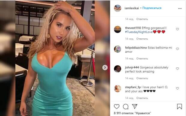 В этот же раз спортсменке удалось подчеркнуть фигуру платьем бирюзового цвета с глубоким декольте. Лекси показала при этом бюст без белья и впечатлила его размерами. Загорелая кожа звезды и светлые локоны выглядели очень ухожено, что также отметили фанаты в сети. Отметим, что ей нравится это платье, Лекси решила также похвастаться обновкой в своей коллекции платьев, которые она изредка демонстрирует. Вот что пишут в сети: «Красота