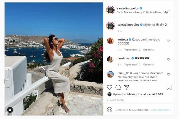 Димопулос присела на забор, немного выгнувши спинку. Звезда продемонстрировала формы без лифа, в тонком платье с открытой спиной и декольте. Завершили летний образ стильные очки и босоножки. "Наконец-то Миконос