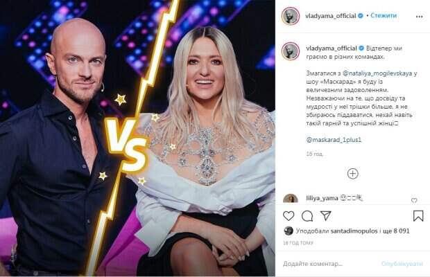 Влад Яма рассказал, что схлестнется с певицей Натальей Могилевской в новом состязании Как передает Politeka.net, об этом он написал на своей странице в «Инстаграм». «Теперь мы играем в разных командах. Соперничать с @nataliya_mogilevskaya в шоу «Маскарад» я буду с огромным удовольствием. Несмотря на то, что опыта и мудрости у нее немного больше, я не собираюсь поддаваться, пусть даже такой хорошей и успешной женщине», - написал он.