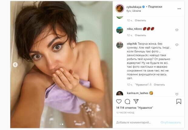 Об этом пишет Politeka.net со ссылкой на страничку знаменитости. "С тебя смайлик в комментариях, если не спишь", - подписала загадочно фото Оля. Фанаты поставили более 14 тысяч лайков и написали комментарии: "Тебе дорого в клубничную индустрию, а не в музыку", "Красотка", "Боже, что за странная фотка. Ну кто так делает фото?", "Красотка, глаза...", "Не могу смайликов подобрать", "Кошечка", "Невероятная", "Творческая женщина, без сомнений. Но имей достоинство, иногда. Когда видишь такие фото, думаешь: зачем такое делает твой кумир. От рельно отворачивает. Ну не будь как другие. Я такие фото считаю откровенными, которые не должны быть показаны всему миру". Сообщалось, что популярная украинская певица Оля Цибульская сверкнула идеальным телом в одном халате. На опубликованных кадрах Цибульская позирует сперва в халате, потом в различных платьях. Мы писали, что украинская певица Ольга Цибульская призналась, что крутила роман с экс-участником шоу "Танці з зірками". В один момент у звезды стал выбор между ее мужем (тогда еще просто парнем) и танцором Александром Прохоровым. Она рассказала в программе "Зірковий шлях" о романтической истории, которая приключилась с ней шесть лет назад. "Он такой самец. Высокий, красивый, талантливый, харизматичный", — рассказала певица о достоинствах мужчины. Напомним, Цибульская, изменявшая жениху с победителем "Танців з зірками", переключилась на девочек А еще Politeka писала, что игривая Ольга Цибульская сняла белье и показала горячий пирожок Также Politeka сообщала, что подвыпившая Ольга Цибульская без белья повисла на шторе и покрутила бедрами