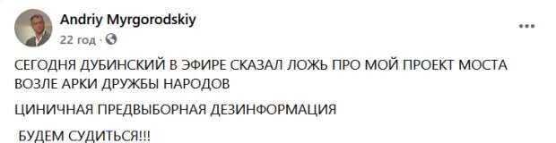 Андрей Миргородский подчеркнул, что авторство проекта пешеходного моста возле Арки Дружбы народов принадлежит ему Заслуженный архитектор Украины записал видеообращение в ответ на заявление нардепа Александра Дубинского. Видео, снятое на фоне того самого моста, он опубликовал на своей странице в Фейсбук.