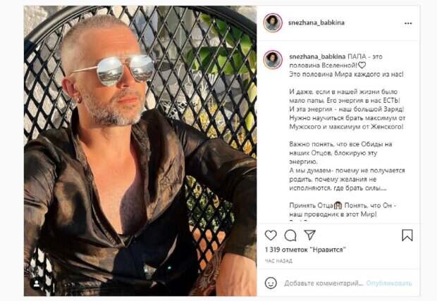 Это половина Мира каждого из нас! И даже, если в нашей жизни было мало папы, Его энергия в нас ЕСТЬ! И эта энергия - наш большой Заряд! Нужно научиться брать максимум от Мужского и максимум от Женского! Важно понять, что все Обиды на наших Отцов, блокирую эту энергию. А мы думаем- почему не получается родить, почему желания не исполняются, где брать силы,... Принять Отца, Понять, что Он - наш проводник в этот Мир! Все! Этого достаточно, для Благодарности!!! А если Папа ещё и внимание уделял, покупал подарки, обнимал, разговаривал...- так это вообще Космос! Мы приходим к такому Папе, который даст нам необходимые опыты, и это те опыты, в которых нуждается наша душа‼️ Мы сами Его выбрали‼️‼️‼️ Я в детстве мечтала, что у меня будет полноценная семья и много детей! И Бабкин осуществил мою самую главную Мечту!", - написала Снежана. На фото Сергей был в рубашке, которую расстегнул, а также стильных очках. Красавчик сидел на улице, впечатляя брутальным образом. Сообщалось, что известный украинский музыкант Сергей Бабкин рассказал о своем маленьком сыне в его день рождения. На снимках счастливый отец показал яркие момент с маленьким сынишкой. На первых кадрах Елисей еще совсем крошечный, но очень милый малыш. А дальше на снимках видно, как н взрослел. Напомним, жена Сергея Бабкина призналась, как изменилась с рождением третьего ребенка А еще Politeka писала, что жена Сергея Бабкина подшутила над своими детьми, семейные кадры Также Politeka сообщала, что жена Бабкина приподняла кофту, засветив достоинства фигуры
