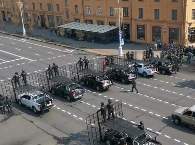 Это воскресенье отличается от прошлого в Минске. Если неделю назад силовики оцепили только стелу "Минск — город герой", но позволили протестующим пройти на площадь Независимости, то в этот раз практически весь центр оцеплен. Фото: Кадр из видео Сейчас колонна спецтехники от площади Независимости начала движение по проспекту Независимости к протестующим, сообщает "Говорит Москва".