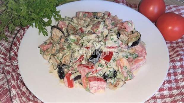 Вкусный, сочный сезонный салат с баклажанами, помидорами и огурцами отлично подойдет к мясным блюдам. Прекрасен как самостоятельное блюдо на ужин. Ингредиенты баклажан 1 шт.; помидор 1 шт.; огурец 1 шт.; чеснок 3 зуб.; петрушка 1 пуч.; масло растительное 2 ст.л; сметана 2 ст.л.; соль по вкусу. Приготовление: 1 Видео-рецепт приготовления.