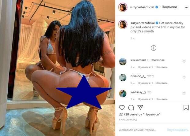 Крохотное белье внизу держалось на маленьких завязочках. Казалось тоненькие плавки потерялись между ягодиц, которые Кортес выставила без стеснения прямо в камеру - пикантней не бывает. Крохотный лифчик держался на пышной груди звезды, а тонкие бретельки натянулись на плечах. Модель сидела напротив зеркала на корточках. Она широко расставила ноги, обутые в босоножки на высоких каблуках. Волосы она распустила, спрятав за ними спину. Кортес не смотрела в камеру, на ее лице можно заметить легкую улыбку. За пять часов пост собрал более 20 тысяч лайков и много комментариев. Пользователи сети пришли в восторг от совершенных форм знаменитости, ее упругих ягодиц и стройной талии. Люди написали звезде массу приятных сообщений. Напомним, Сьюзи Кортес предстала в черном лифчике, который подтянул ее шикарную грудь. Тонкие лямки натянулись на плечах и едва держались на месте. Крохотные трусики на черных лямках едва скрывали самое интимное. Игривый бантик на белье добавил образу некой пикантности. Ранее сообщалось, что Сьюзи Кортес позировала в джинсовых штанах и черном топе. Модель спустила штаны, демонстрируя белые стринги, которые почти ничего не прикрыли. Красотка развернулась пятой точкой к камере, чтобы показать свой "орешек" во всей красе. Напомним, хозяйка самых красивых ягодиц сладко выгнулась в дерзкой сеточке: слишком горячо Также Politeka писала, что хозяйка самых красивых ягодиц сняла с себя все лишнее, блеснув "бриллиантами": "Лифчик только мешал" А еще Politeka сообщала, что хозяйка самых красивых ягодиц показала свой "титул" экстремально близко: "Идеальный орешек"