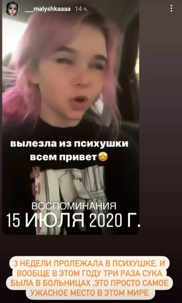 17-летняя дочь бывшего вратаря сборной России и "Зенита" Вячеслава Малафеева рассказала, что в 2020 году она три недели пролежала в психбольнице Признание она опубликовала на своей станице в соцсети. "Это был самый бесполезный, ненасыщенный, отвратительный год. Три недели пролежала в психушке. И вообще в этом году три раза была в больницах.