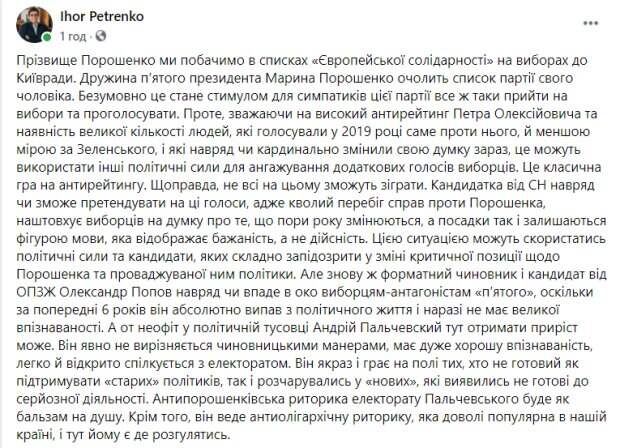 Однако, несмотря на высокий антирейтинг Петра Алексеевича и наличие большого количества людей, которые голосовали в 2019 году именно против него, и в меньшей степени за Зеленского, и которые вряд ли кардинально изменили свое мнение сейчас, это могут использовать другие политические силы для ангажирования дополнительных голосов избирателей. Это классическая игра на антирейтинге", - уверен он Также эксперт объяснил, благодаря чему увеличивает электоральную базу Андрей Пальчевский и его политическая сила. «Неофит в политической тусовке Андрей Пальчевский здесь получить прирост может. Он явно не отличается чиновничьими манерами, имеет очень хорошую узнаваемость, легко и открыто общается с электоратом. Он как раз и играет на поле тех, кто не готов как поддерживать «старых» политиков, так и разочаровались в «новых», которые оказались не готовы к серьезной деятельности. Антипорошенковская риторика электората Пальчевского будет как бальзам на душу. Кроме того, он ведет антиолигархическую риторику, которая довольно популярна в нашей стране, и здесь ему есть где разгуляться», - подытожил Игорь Петренко. Напомним, недавно Андрея Пальчевского выдвинули в мэры.