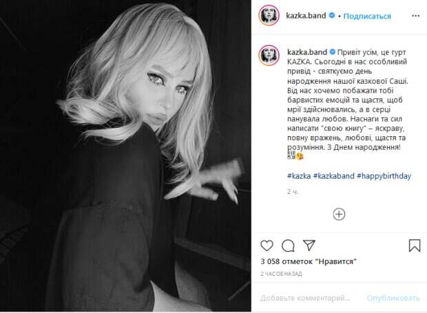«Сегодня у нас особый повод - празднуем день рождения нашей сказочной Саши. От нас хотим пожелать тебе красочных эмоций и счастья, чтобы мечты осуществлялись, а в сердце царила любовь. Сил и выдержки написать "свою книгу" - яркую, полную впечатлений, любви, счастья и понимания. C Днем рождения!», - говорится в публикации. Текст сопровождается черно-белой фотографией исполнительницы, на которой Александра позирует с непривычными для нее светлыми волосами. Надо отметить, что исполнительнице очень идет образ роковой блондинки. К тому же, на снимке она выглядит заметно похудевшей. Поклонники артистки тут же принялись комментировать пост, присоединяясь к поздравлениям. Некоторые также заметили на фото сходство с другими известными певицами. «Алла Борисовна?», «Ни фига себе девушка», «Счастья тебе, красавица», «Адель?», «На Пугачеву похожа», - пишут люди. До этого мы писали, что Зарицкая с командой пришла на юбилейную программу Кати Осадчей, которая проходила в ботаническом саду Киева. На одном из снимков девушка позирует вместе со своей группой подтанцовки, демонстрируя женственность и красоту. Напомним, пышногрудая KAZKA пошла на крайность ради смены имиджа, пикантные кадры: "Вот это номер! ". Как сообщала Politeka, солистка KAZKA на красной дорожке показала, как выглядит пышная красота: «Мисс Украина, не меньше!». Также Politeka писала, что солистка KAZKA показала пышную гордость в кружевах экстремально близко: "О да, малышка!".