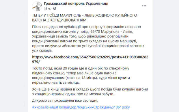 Укрзализныця убрала кондиционирование во всех купейных вагонах Новшество коснулось поезда 69/70, который следует по маршруту Львов - Мариуполь. В составе оставили лишь один вагон, в котором есть кондиционер - люксовый. Но билеты на него нереально купить даже за месяц. Об этом сообщили на странице Общественный контроль Укрзализныци в Facebook.