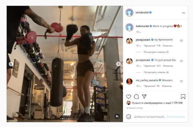 Известная модель Белла Хадид, которую хирурги назвали самой красивой женщиной в мире по принципу золотого сечения, показала, как проходит тренировка Как пишет Politeka.net, Белла Хадид является популярной мировой моделью. Красотка также увлекается боксом и иногда показывает, как проходят тренировки, впечатляя фанатов в Инстаграм.