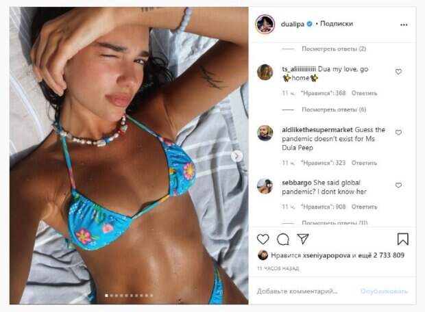 Кадр получился горячим и зажигательным, ведь певица выглядит безупречно. Об этом пишет Politeka.net со ссылкой на страничку знаменитости. Фанаты поставили несколько миллионов лайков и написали комментарии: "Скучаю по тебе ...", "Обожаю эту цыпочку !!!!", "Оставайся дома", ты сказала, помнишь?", "вау, я не знал, что пандемия закончилась", "Хватит путешествовать, девочка, я не могу защитить тебя, нет", "люблю тебя, но разве это не похоже на глобальную пандемию", "Девушка бросила публиковать фото из отпуска, ты хоронишь себя заживо", "Думаю, пандемии не существует для г-жи Дуа Липы". Мы писали, что известная британская певица Дуа Липа впечатлила сменой имиджа. Певица была одета в белое обтягивающее платье, которое подчеркнуло ее стройную фигурку. Девушка вытянулась на диване, едва не упустив свой бюст. Подкачанный руки звезды впечатлили фанатов, а многочисленные татуировки на теле привлекли внимание. Напомним, непредсказуемая Дуа Липа с новой стрижкой и в кружевах поманила к себе томной позой А еще Politeka сообщала, что страстная Дуа Липа в платье с неприличными разрезами лишила мужчин спокойствия Также Politeka писала, что дерзкая Дуа Липа в коже устроилась на полу, посветив своим богатством