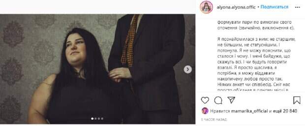 В публикации рэперша рассказала историю знакомства с ним. «Я познакомилась с ним: не старше, ни больше, ни статуснее. И утонула. Я не могу объяснить, что произошло и почему. И мне все равно, что скажут все. И будут говорить вообще. Я просто счастлива, я нужна, я могу отдавать накопленную любовь просто так. Никаких анкет или собеседований. Снег нас просто объединил в одном месте в одно время и закопал под своей любовью. А мы и рады. Ведь все интересное впереди», - написала Алена Савраенко. В завершении девушка добавила, что их объединяет кофепитие. В комментариях поклонники пожелали Алене счастья. "Такая счастливая за вас", "Аленка, будь счастлива", - пишут в сети. Напомним, Alyona Alyona в прозрачной юбке сразила наповал Санину из "Танців з зірками", необычное фото: "Вау, какая девочка..." Раньше Politeka сообщала, что мужчины объявили охоту на Alyona Alyona после "Танцев со звездами" Также Politeka писала, что Могилевская взяла в оборот партнера Alyona Alyona по «Танцях з зірками», бородач оказался не против: «Нашла сказочных…»